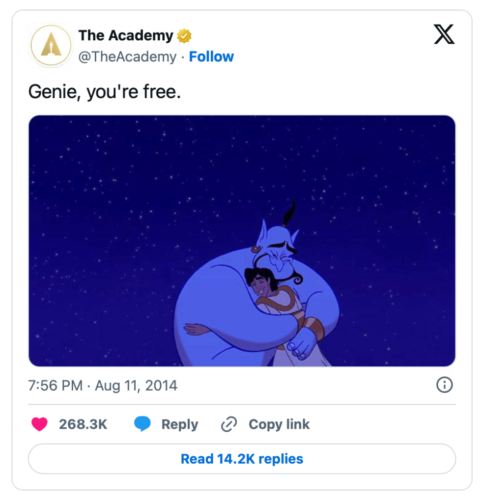 Aladdin was never in the forefront of influential Robin Williams films for me, but The Academy shared a three word tweet in honor of Mr. Williams passing. I don’t know about you, but it’s hard for not to get a little misty-eyed when reading it: