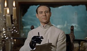 The Villain: Portrayed by the capable Joseph Wiseman, Dr. No is more like a prototype villain. What he brought to the table was used as a launching pad for the rest of franchise. He’s maniacal, self-centered, but only a wee bit over the top, especially compared to most of his predecessors. When his brilliant mind (and metal hands) are dismissed by the Americans, Dr. No becomes an agent of SPECTRE (see below), sets up shop in Jamaica with his Hotel Spa & Murder Resort, and begins to Terrorize the U.S.-based rocket launches taking place in Florida. You can’t argue that Dr. No is determined, albeit a little silly in his plans.